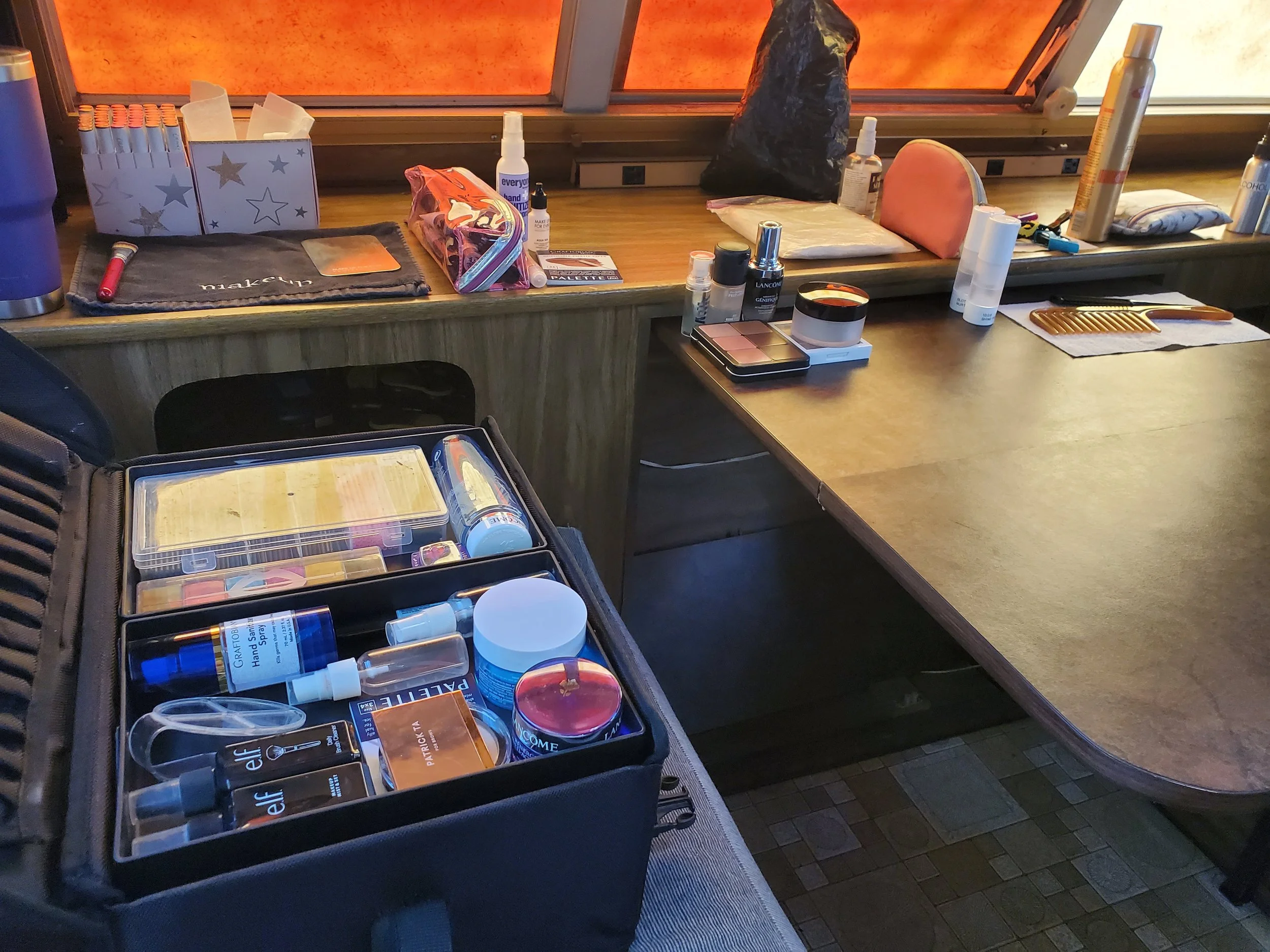 We have a lot of mirrors and lights, and cords for hair dryers, steamers, curlers, whatever you need. AC in the summer, or Heat in the winter, and the bathroom. (make-up not included).